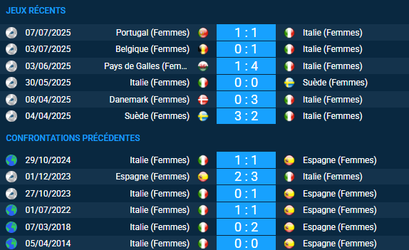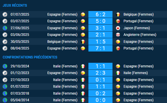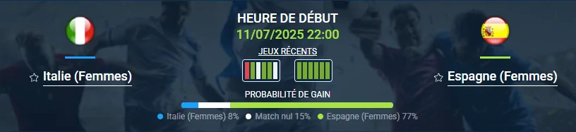 Le match devrait être spectaculaire grâce au potentiel offensif des deux équipes. Malgré l’avantage de l’Espagne, la défense italienne pourrait maintenir le suspense. Vu la tendance aux matches prolifiques de l’Espagne, le pari recommandé pour ce pronostic Italie (Femmes) – Espagne (Femmes) est un total de plus de 2,5 buts.