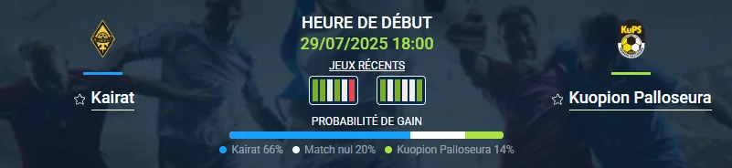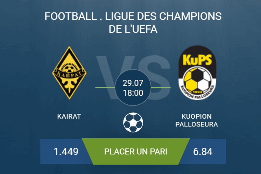 Notre pronostic Kairat – KuPS : victoire ou défaite de KuPS avec handicap (+1,5).
