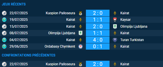 Les Finlandais arrivent au Kazakhstan forts de 8 matches sans défaite (5 victoires, 3 nuls, 3 clean sheets sur cette période) et d’une prestation solide à l’aller. La jeunesse de Mohamed Touré (4 buts lors de ses 6 derniers matchs) est l’un de leurs atouts majeurs. KuPS sait bloquer les espaces et défendre un score, y compris à l’extérieur.