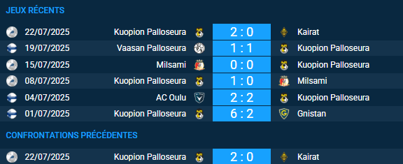 La seule rencontre officielle a eu lieu le 22 juillet 2025 : victoire 2-0 de KuPS à domicile.