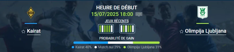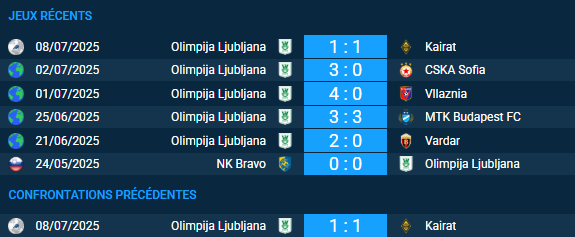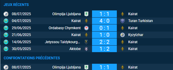 Le seul précédent entre Kairat et Olimpija Ljubljana a eu lieu le 8 juillet 2025. Les deux équipes se sont quittées sur un résultat nul (1-1) en Slovénie. L’Olimpija a largement dominé la possession (64 %) mais n’a cadré qu’un seul tir, tout comme Kairat. Ce résultat reflète deux formations prudentes dans la première manche, mais le contexte du match retour pourrait favoriser plus d’audace, surtout du côté kazakh.