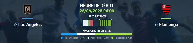 Personne n’aurait imaginé que Flamengo décrocherait la première place du groupe avant même la dernière journée. L’équipe a affiché un excellent niveau de jeu dans les deux premiers matchs : victoire tranquille sur l’Espérance (2-0) puis un succès impressionnant contre Chelsea (3-1), alors qu’ils étaient outsiders selon les pronostics. Malgré une erreur inhabituelle qui a profité à Pedro Neto, Flamengo a réagi en dominant totalement la rencontre et en créant de nombreuses occasions (3.03 xG). Les Brésiliens n’ont quasi rien laissé aux Londoniens, remportant logiquement la partie. Pour ce pronostic Los Angeles-Flamengo, on attend peut-être une rotation de l’effectif, mais le respect des consignes FIFA garantira une équipe compétitive.