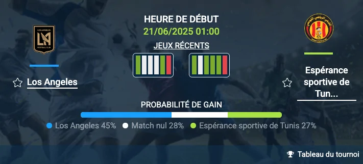 Le pronostic LosAngeles-Espérance pour la deuxième journée de la phase de groupes du Mondial des clubs s’annonce crucial. LosAngeles peut-il décrocher les trois points face à Espérance ? Le match LosAngeles-Espérance se déroulera à Nashville, offrant au club américain un net avantage grâce au soutien de ses supporters. Les deux équipes ont perdu leur premier match et n’ont plus droit à l’erreur, car une défaite les priverait même de chances théoriques de qualifications en play-off. Ce pronostic LosAngeles-Espérance promet donc une lutte serrée où la moindre erreur sera fatale.