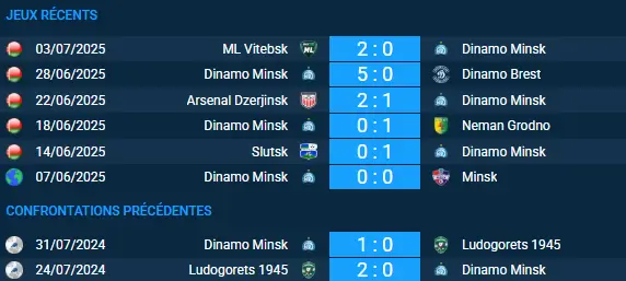 Les deux équipes ne se sont affrontées qu’à deux reprises officiellement, dont la dernière en date le 31 juillet 2024, avec une victoire 1-0 de Dinamo Minsk. Pour ce match (Dinamo Minsk à domicile) :