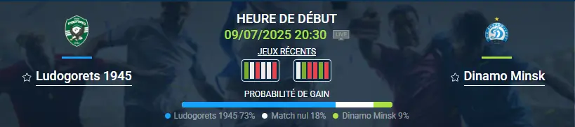 Le pronostic Ludogorets 1945 – Dinamo Minsk s’annonce comme un rendez-vous très tactique au premier tour de qualification de la Ligue des champions. Ludogorets, particulièrement solide à domicile malgré ses contre-performances en amical, reste la référence bulgare grâce à sa défense rigoureuse et son aptitude à contrôler le rythme d’un match. Dinamo Minsk, pour sa part, arrive avec une dynamique plus inconstante, alternant victoires et revers ces dernières semaines. Ce pronostic Ludogorets 1945 – Dinamo Minsk s’annonce indécis tant l’enjeu du match aller est grand avant la confrontation retour.
