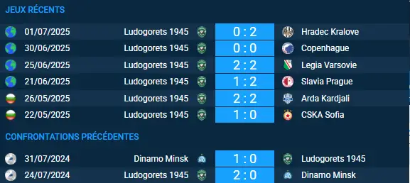 Le bilan reste très court, mais montre des affrontements disputés et très physiques. Ludogorets, cette fois à domicile, aura à cœur d’inverser la tendance dans le cadre de ce pronostic Ludogorets 1945 – Dinamo Minsk.