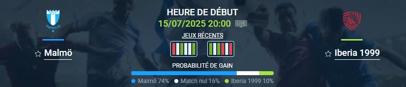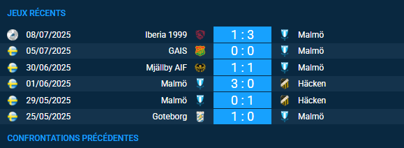 Le dernier et unique face-à-face officiel entre Malmö et Iberia 1999 a eu lieu le 8 juillet 2025. Les Suédois se sont imposés à l’extérieur (3-1) malgré une possession légèrement inférieure (47% contre 53%). Le match était pourtant équilibré au niveau des occasions :