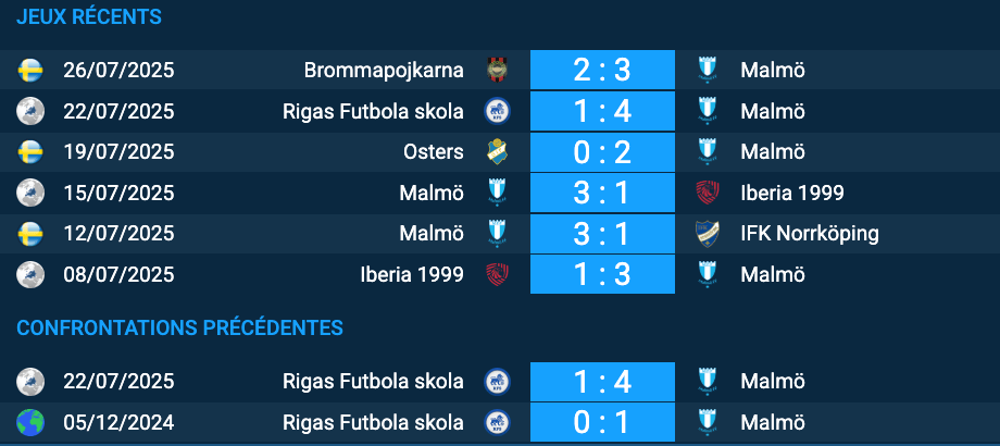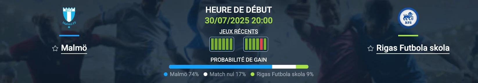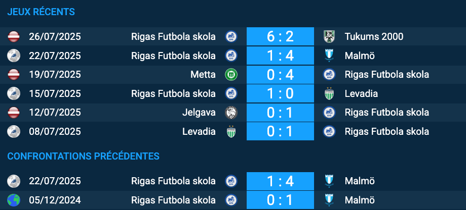 En Virsliga, RFS a écrasé Tukums 6-2 (56 % de possession, 11 tirs cadrés), confirmant sa bonne dynamique offensive à l’extérieur (buts lors de ses 11 derniers déplacements, 5 victoires récentes en déplacement). Mais le contexte est tout autre en Ligue des champions : à l’aller, les Lettons sont restés trop justes dans chaque secteur de jeu face à Malmö. Renverser la situation au retour paraît utopique.
