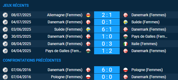 Les Danoises ont perdu 1-2 face à l’Allemagne lors de leur dernier match, avec seulement 28 % de possession mais une certaine efficacité devant le but adverse (quatre tirs cadrés). Lors de la première journée contre la Suède, elles n’ont pas réussi à revenir au score malgré de bonnes occasions (0-1). Le Danemark occupe la troisième place du groupe, avec un bilan décevant mais des ressources pour bien finir.