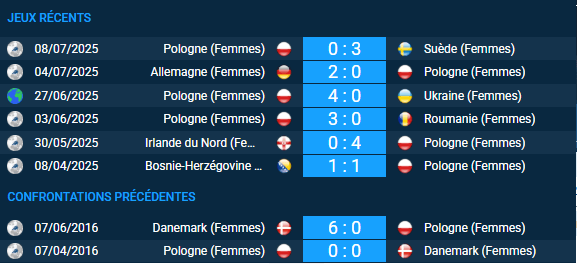 Au deuxième tour contre la Suède, les Polonaises se sont inclinées 0-3. Elles ont eu 47 % de possession et cadré deux tirs. Dans la première rencontre avec l’Allemagne, la Pologne a résisté une mi-temps avant de concéder deux buts (0-2). Au final, la sélection termine dernière du groupe avec cinq buts concédés et aucun marqué. Après ce pronostic match Pologne Danemark femmes, la Pologne quitte le tournoi sans avoir trouvé la faille offensivement.