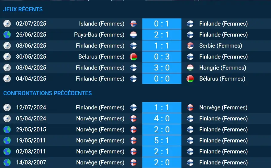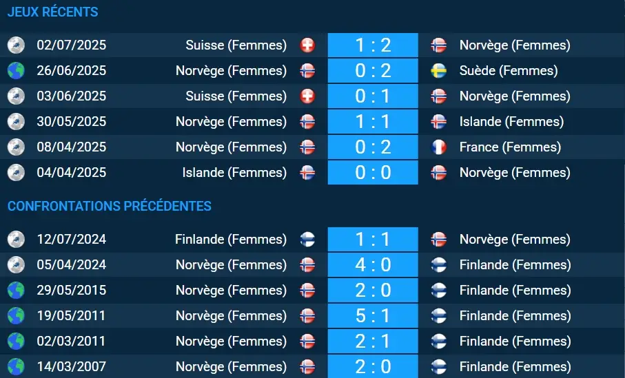 Le deuxième tour de l’Euro féminin 2025 propose un duel inattendu en tête du Groupe A : Norvège (Femmes) contre Finlande (Femmes). Les deux équipes, longtemps outsiders en qualifications, peuvent déjà valider leur billet pour le prochain tour en cas de victoire ici. Sur le papier comme dans l’historique, la Norvège part favorite : jamais battue en confrontations directes, elle a remporté une victoire et concédé un nul face à la Finlande lors des éliminatoires.