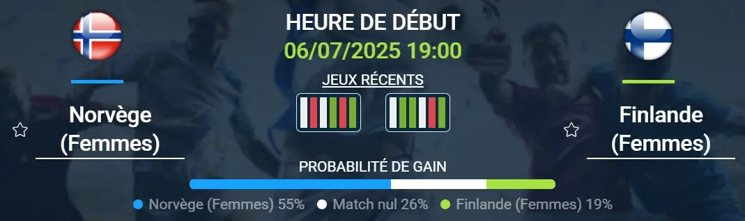 La Norvège n’a jamais perdu contre la Finlande en compétition officielle, ce qui justifie son statut de favori. Mais attention : la Finlande reste difficile à bousculer (aucune lourde défaite depuis près d’un an) et la Norvège n’a plus marqué plus de deux buts dans un match depuis longtemps. Notre pronostic Norvège (Femmes) – Finlande (Femmes) :
