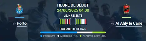Le pronostic Porto-Al Ahly le Caire attire l’attention : la participation de ces équipes au Mondial des clubs est-elle déjà terminée ? Au MetLife Stadium du New Jersey, lors de la 3e journée, Porto et Al Ahly, 3e et 4e du groupe A, vont s’affronter. Les deux équipes comptent le même nombre de points, mais la différence de buts place les Portugais devant. Même si, selon le pronostic Porto-Al Ahly le Caire, les chances de qualification sont minimes, elles restent mathématiquement possibles. Quels sont les scénarios pour chaque équipe et quel est le pronostic Porto-Al Ahly le Caire proposé par notre rédaction ? Découvrez-le ci-dessous.
