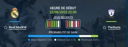 Après la prestation mitigée du Real Madrid lors du premier tour, il est difficile d’attendre une domination totale : gagner contre Pachuca – un pronostic Real Madrid-Pachuca pertinent – est cependant impératif sous peine d’une élimination prématurée. Nous voyons bien une victoire du Real, mais pas sur un score fleuve, peut-être 3-1. Observant les nombreuses surprises de ce Mondial des clubs, nous privilégions un pari sur le « plus de 2,5 buts » : ce pronostic est validé dans 7 des 8 derniers déplacements de Pachuca, et même 8 sur 9 en comptant Salzbourg.