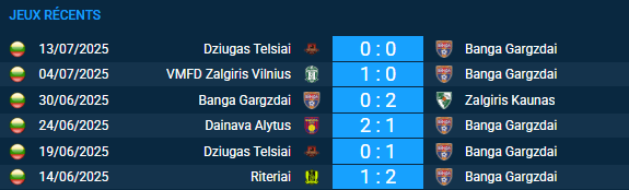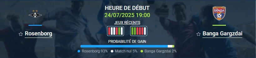 Banga Gargzdai, huitième du championnat lituanien, aborde ce défi européen sans véritable pression mais avec discipline. Son dernier nul 0-0 face à Dziugas souligne une philosophie de jeu défensive et beaucoup de patience. L’équipe manque toutefois d’expérience sur la scène continentale et son rendement offensif demeure limité (1 seul tir cadré au dernier match). Mais la rigueur et l’envie pourraient leur permettre de tenir tête à Rosenborg, au moins en première période.