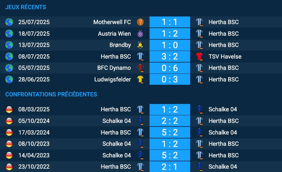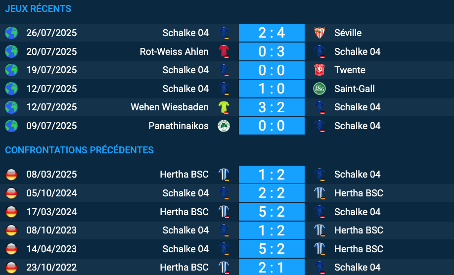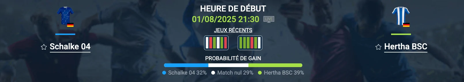 Les deux clubs devraient immédiatement chercher à marquer les esprits. L’historique des confrontations directes est souvent productif, et la dynamique offensive de la pré-saison laisse espérer un match animé. Notre pronostic Schalke 04 – Hertha BSC : plus de 2,5 buts, avec une victoire probable de Schalke (2-1).