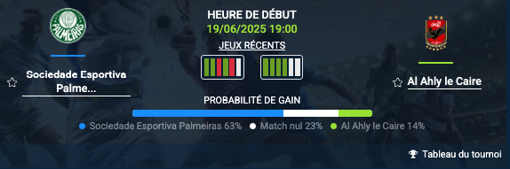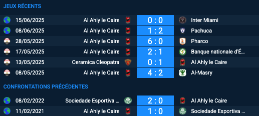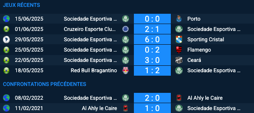 Les équipes se sont rencontrées deux fois. La première, en 2021 lors de la Coupe du Monde des Clubs : après un 0-0, Al Ahly s’est imposé aux tirs au but (3-2) et a décroché la médaille de bronze. La deuxième fois, lors de l’édition 2022 en demi-finale, Palmeiras l’a emporté 2-0.