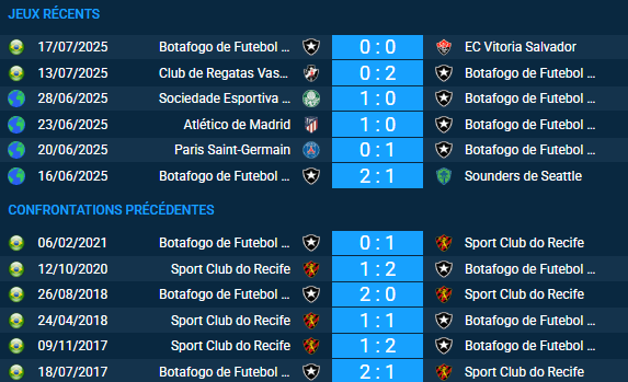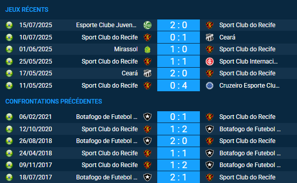Sur les 20 derniers duels officiels, Botafogo mène clairement la danse : 10 victoires contre 4 pour Recife, avec 6 nuls. Le total de buts s’élève à 51 (20 pour Recife, 31 pour Botafogo) soit un ratio de 2,55 par match.