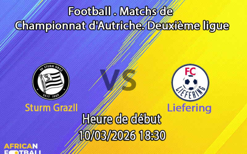 Mardi 10 mars 2026, 17h30 — Solarstadion, Gleisdorf, Styrie. La 2. Liga autrichienne oppose le SK Sturm Graz II (14e, 15 pts, 3V-6N-9L en 18 matchs) au FC Liefering (7e, 29 pts, 7V-8N-4L en 19 matchs). Liefering est favori en déplacement grâce à un écart de 14 points et une forme récente excellente (WDWWW). Le match aller s’était terminé Liefering 2-2 Sturm Graz II (buts : Aguilar 45′, Verhounig 34′ / Włodarczyk 53′, Scharmer 86′). Les cotes : Sturm II ~3.20, nul ~3.40, Liefering ~2.10-2.30.