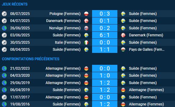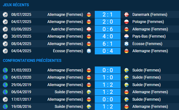 L’Allemagne reste sur 8 matchs sans défaite. Après avoir maîtrisé la Pologne (2–0), elle a renversé le Danemark (2–1) grâce à sa force collective et à l’efficacité de Lea Schüller. Pour finir première, une victoire dans ce pronostic Suède (Femmes) – Allemagne (Femmes) est indispensable.