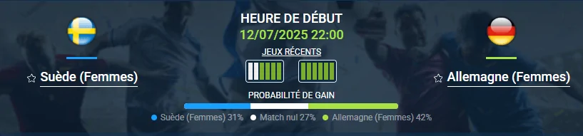 Ce pronostic Suède (Femmes) – Allemagne (Femmes) devrait offrir un match ouvert, avec des occasions des deux côtés. Les deux sélections sont en pleine forme mais laissent parfois des espaces en défense. Nous recommandons un pari sur plus de 2,5 buts. Score probable : 1–2 pour l’Allemagne.