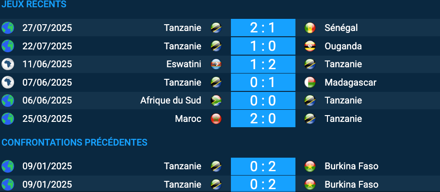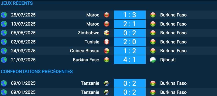 Ce match s’annonce tendu et équilibré entre deux nations en mutation. Les Taifa Stars de la Tanzanie impressionnent récemment, avec une discipline tactique retrouvée et un succès mémorable contre le Sénégal (2-1) qui a mis en lumière leur solidité défensive et leur capacité à piquer en transition. En face, le Burkina Faso a alterné l’excellent (3-1 face au Maroc) et l’inconstant, souffrant parfois en déplacement et dans les rencontres les plus disputées. D’où un pronostic Tanzanie – Burkina Faso ouvert, où chaque détail comptera.
