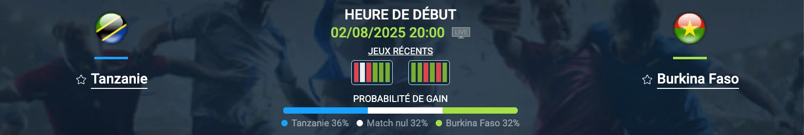 Les deux équipes devraient proposer une bataille serrée, avec une forte organisation tactique de chaque côté. Avantage léger à la Tanzanie, en pleine confiance et meilleure collectivement sur le moment, mais la solidité défensive pourrait l’emporter sur le panache offensif. Notre pronostic Tanzanie – Burkina Faso privilégie le pari : match nul – un 1-1 ou 0-0 paraît probable, même si une courte victoire de la Tanzanie n’est pas à exclure.