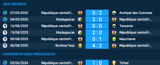 Lors de la dernière journée, le Tchad a perdu à domicile contre le Mali (0-2). L’équipe a complètement raté son match, encaissant des buts dans chaque mi-temps, et a perdu d’autres points précieux dans cette qualification. À ce jour, le Tchad n’a pas encore gagné un seul match – seulement un match nul et huit défaites. Le match contre la République Centrafricaine sera la dernière chance pour l’équipe de marquer des points et d’améliorer sa différence de buts.