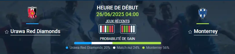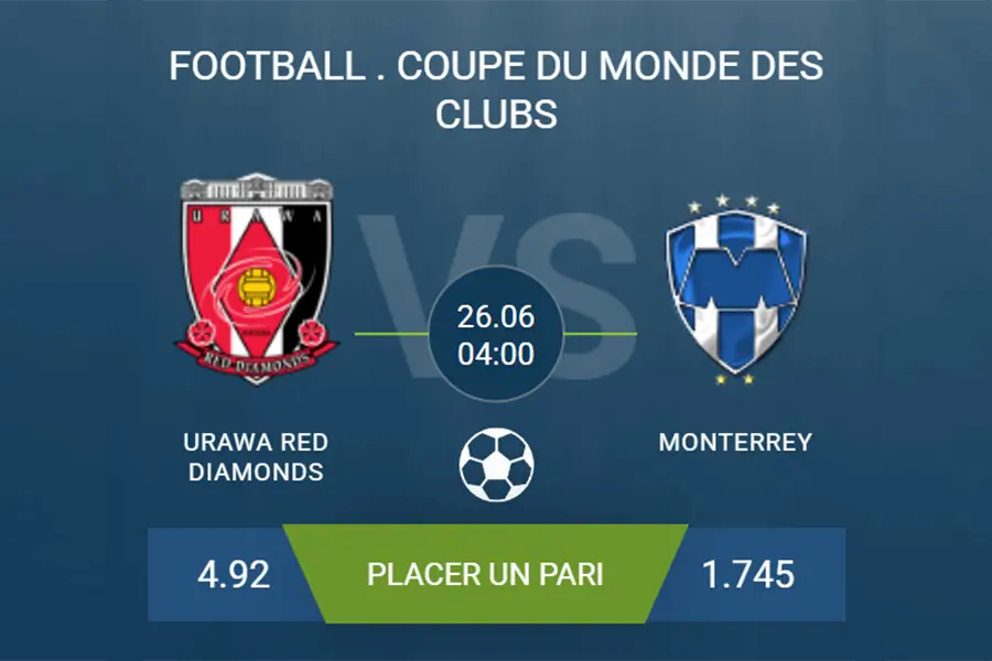 Le pronostic Urawa Red Diamonds-Monterrey porte sur le dernier tour du groupe E au Mondial des clubs, sur la pelouse du Rose Bowl. Urawa Red Diamonds n’a plus aucune chance après deux défaites ; Monterrey, en revanche, garde des espoirs pour la qualification. Pour atteindre les play-offs, les Mexicains doivent impérativement s’imposer et attendre un résultat favorable dans l’autre match du groupe. Retrouvez tous les scénarios et le pronostic Urawa Red Diamonds-Monterrey de notre rédaction ci-dessous.