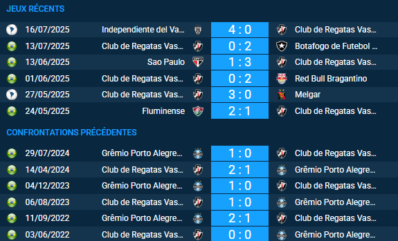 Dernier match officiel : lourde défaite 0-4 face à Independiente del Valle en Copa Sudamericana (possession 22 %, tirs cadrés 3 contre 13). Les «géants de la Colline» peinent à enchaîner depuis le début de saison. Après une victoire à São Paulo lors de la 12e journée, ils ont perdu à domicile contre Botafogo (0-2) puis au match aller de Sudamericana. Actuellement, Vasco occupe la 15e place (13 pts) et une victoire leur permettrait de recoller à Grêmio. Mais à domicile, Vasco reste fragile : 3 défaites en 7 matchs à São Januário.