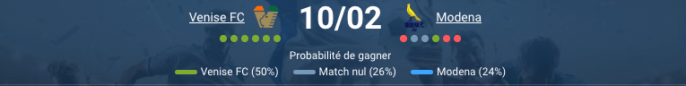 Modena traverse une crise : 3 matchs sans victoire (1-2, 0-0, 0-0). Faible extérieur : 4 wins, 4 nuls, 3 défaites en 11 away (36%). Venezia domine historiquement (71% wins, Modena 0 win). Match aller : Venezia 2-1. Score probable : 2-0 ou 2-1.