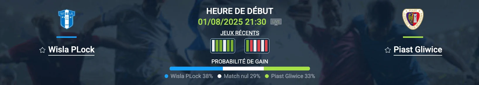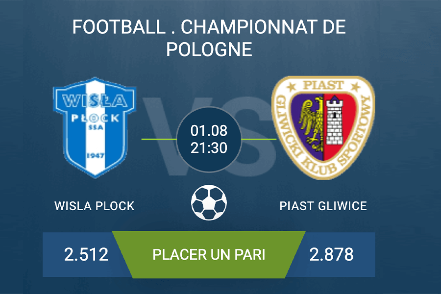 Le match de ce 1er août promet d’être indécis et sous haute tension : Wisla Plock reçoit Piast Gliwice pour une affiche entre deux équipes habituées aux rencontres disputées. Les bookmakers attendent une opposition équilibrée, et la faible moyenne de buts dans les confrontations directes renforce ce sentiment pour ce pronostic Wisla Plock – Piast Gliwice.