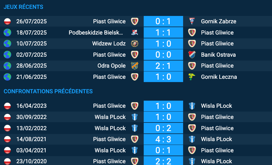 La prudence est de mise, tant les précédents directs sont restés fermés et peu spectaculaires en termes de buts. Notre pronostic Wisla Plock – Piast Gliwice privilégie donc le pari “moins de 2,5 buts”, un scénario fréquent dans ce duel.