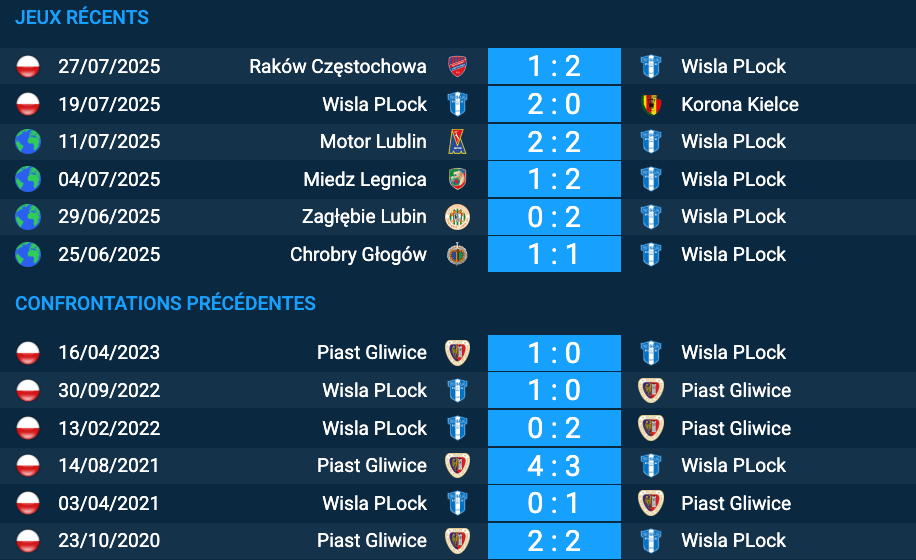 Wisla Plock a bien lancé sa saison en allant s’imposer chez Rakow (2-1). Sur les 10 derniers matchs officiels, les locaux restent solides : 7 victoires, 2 nuls, 1 défaite, avec une moyenne de 1,8 but marqué (1,83 à domicile) et moins d’un but encaissé par match (0,9).