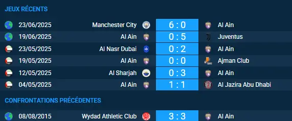 Les deux clubs ne se sont jamais affrontés en compétition officielle ou amicale. Ce sera donc une première pour le pronostic Wydad Athletic Club-Al Ain.