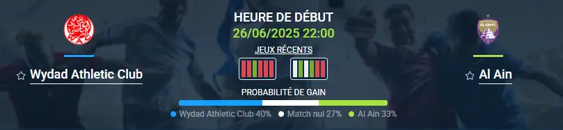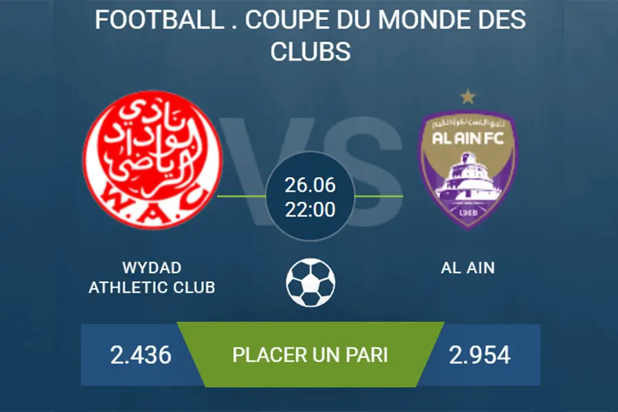 Le pronostic Wydad Athletic Club-Al Ain concerne le duel des outsiders du groupe G en Coupe du monde des clubs. Les deux équipes n’ont pas encore pris de points, comme attendu après le tirage. Le Wydad Athletic Club paraît cependant plus solide, c’est pourquoi il est légèrement favori selon le pronostic Wydad Athletic Club-Al Ain pour cette troisième place. Même en cas de match nul, le club de Casablanca resterait devant grâce à une meilleure différence de buts. Mais nous analysons plusieurs options pour optimiser le pronostic Wydad Athletic Club-Al Ain, en tenant compte de tous les scénarios. À noter : la rencontre se joue à Washington, au Audi Field.