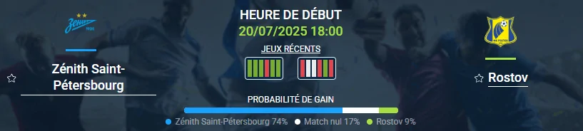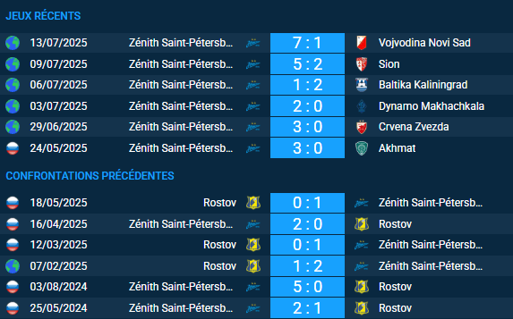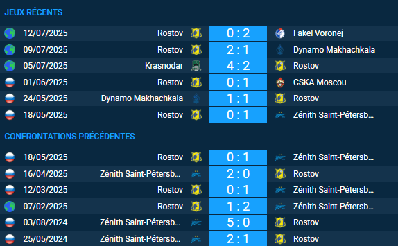Sur les 40 duels récents, le Zénith affiche 65 % de victoires. La saison dernière, il n’a encaissé aucun but en quatre matchs face à Rostov, dont un 5-0 au départ du championnat, puis un 1-0 décisif pour le titre. Le Zénith reste sur six succès d’affilée contre Rostov et a remporté la seconde période lors des huit derniers matchs à domicile face à cet adversaire. Sa dynamique et ses recrues devraient lui permettre de s’imposer à nouveau – d’ailleurs la victoire du Zénith en 2ᵉ mi-temps paraît être un pari judicieux.